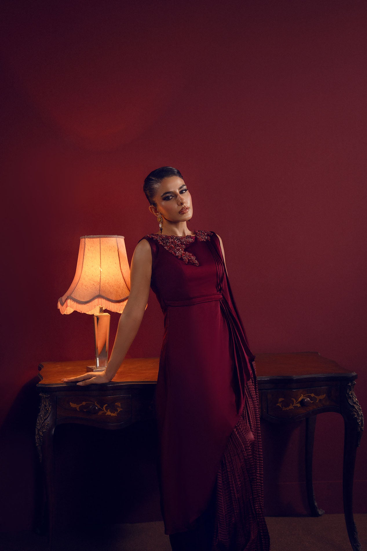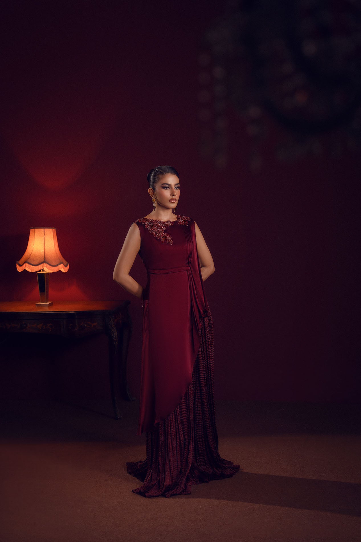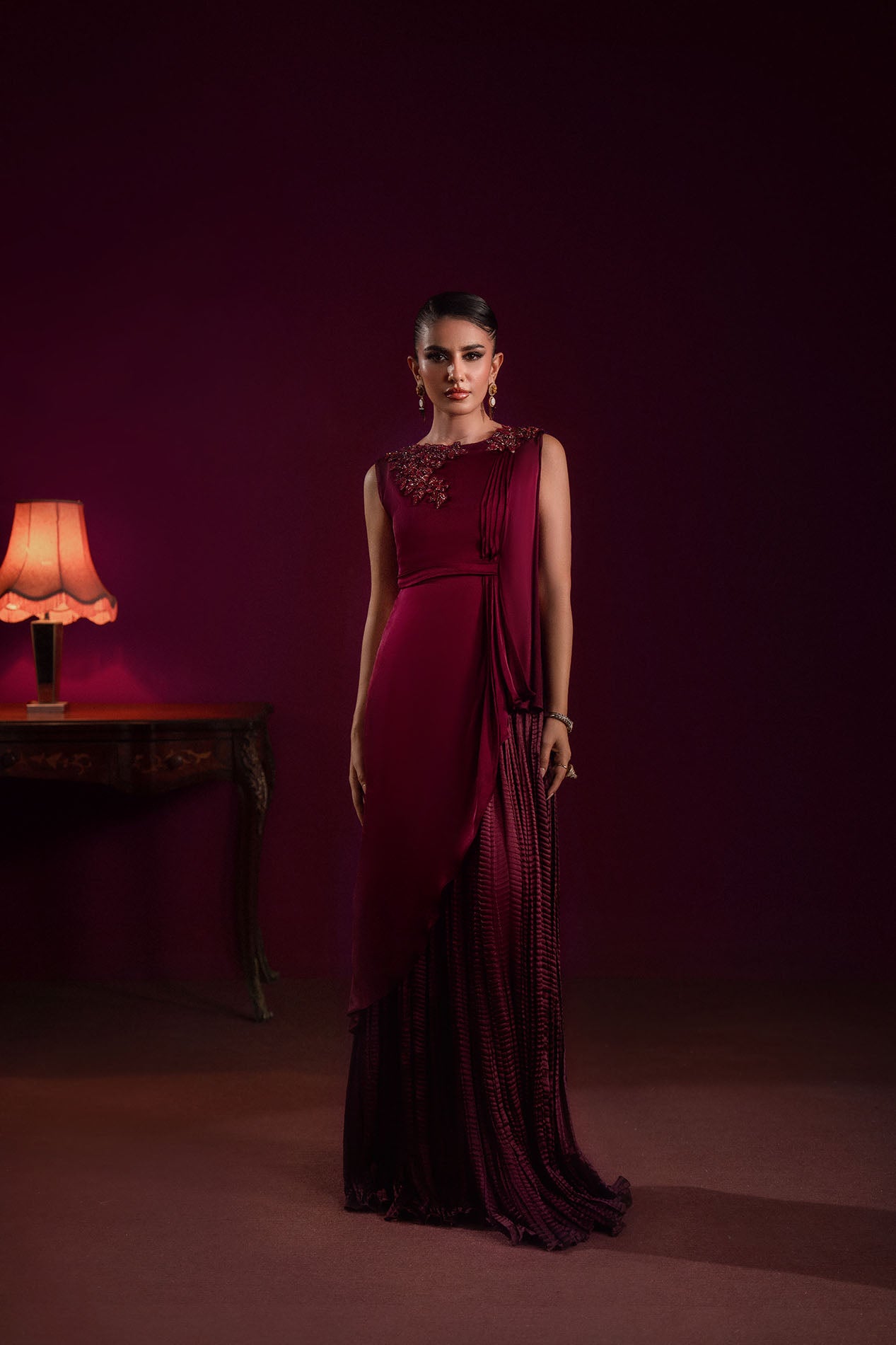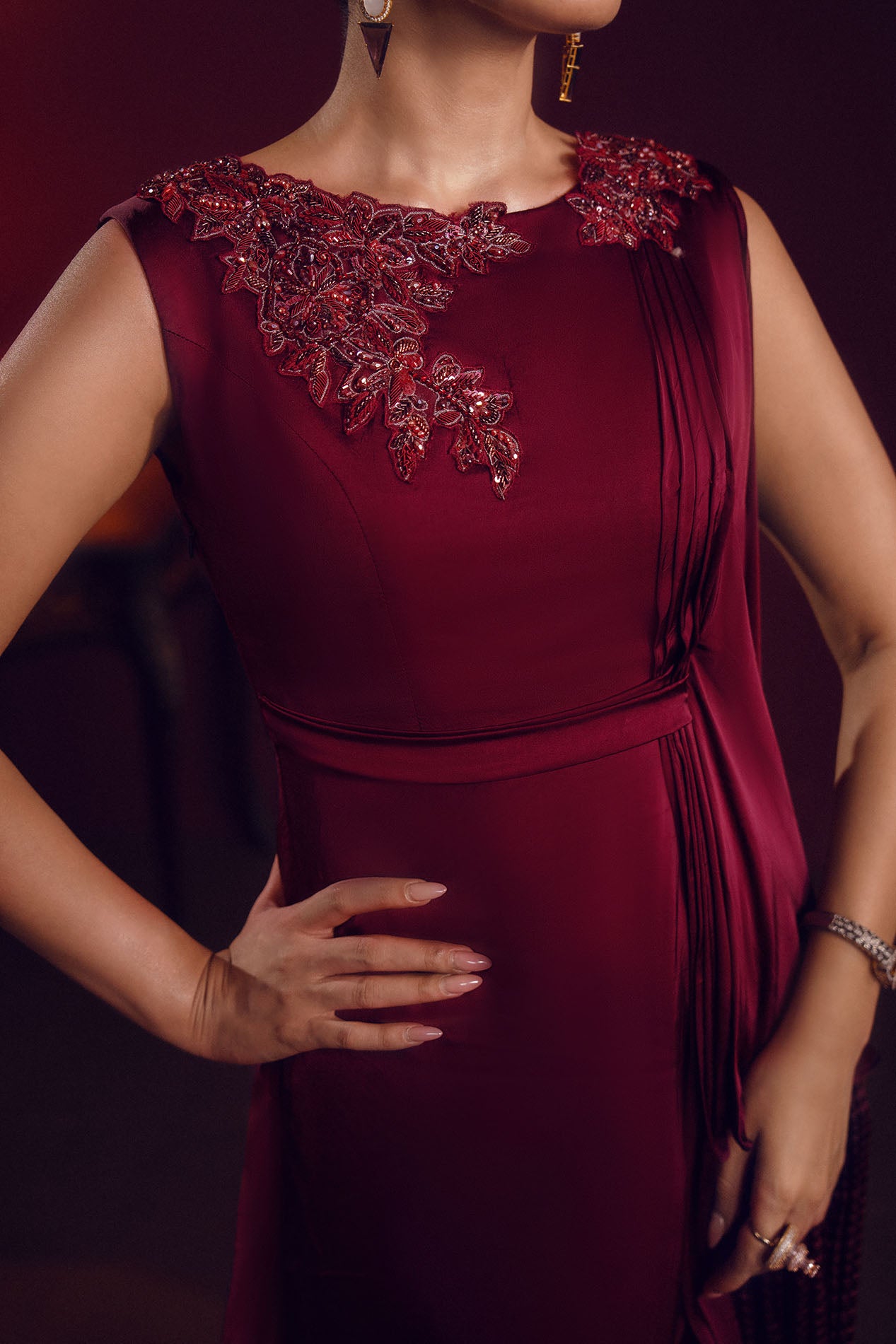 A deep burgundy silk gown featuring a draped silhouette with embellished neckline, radiating power and poise.