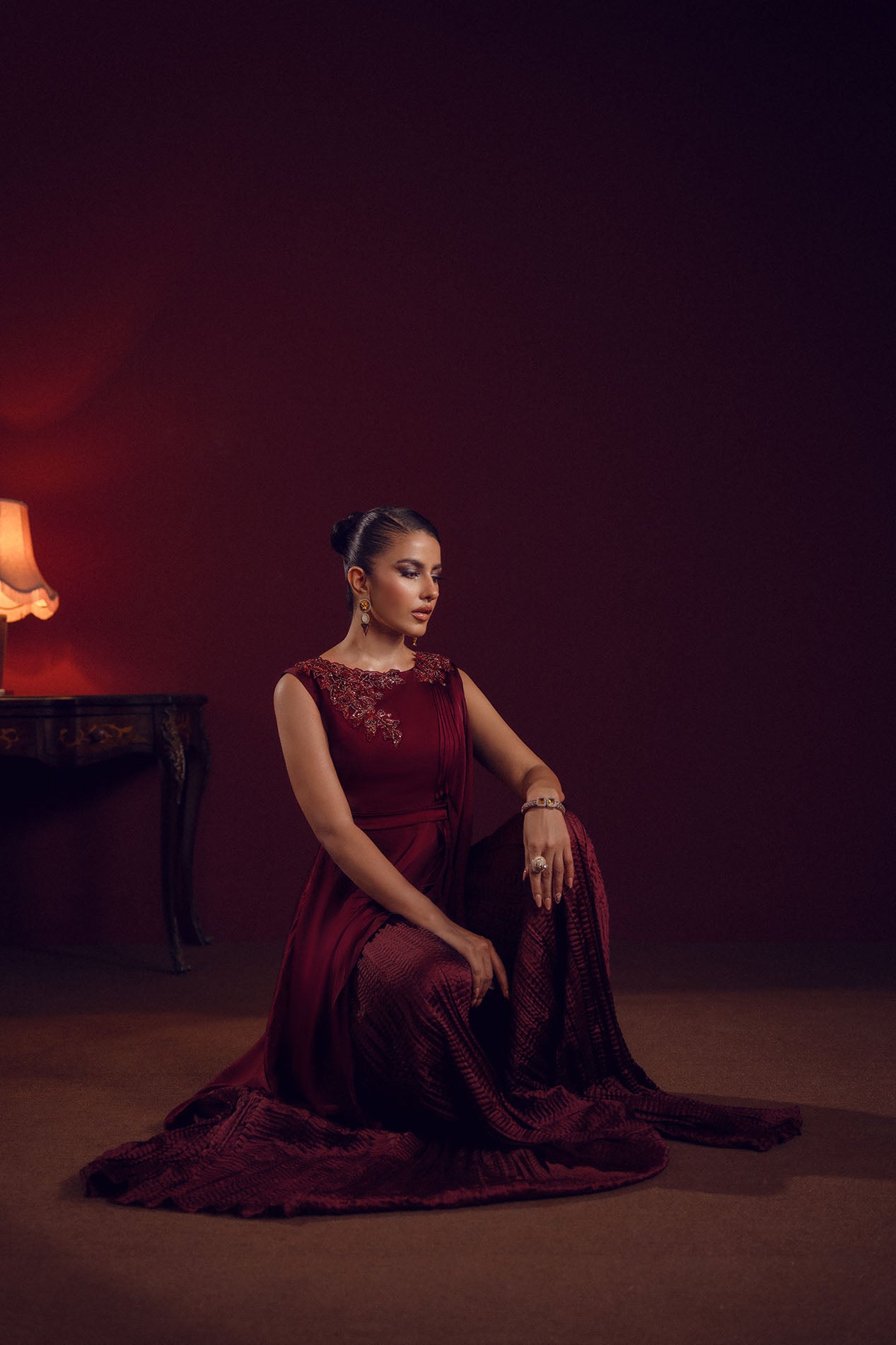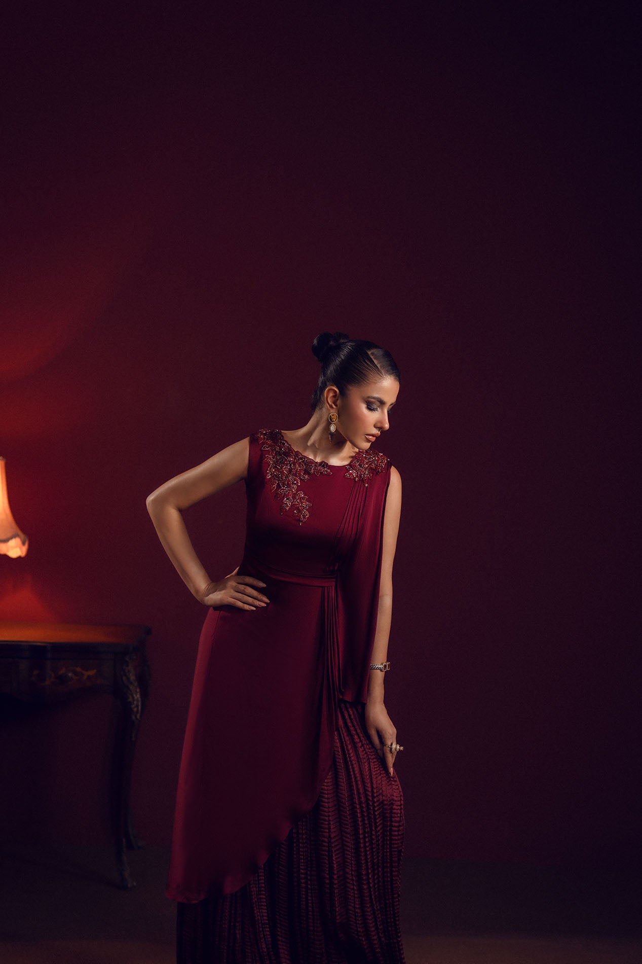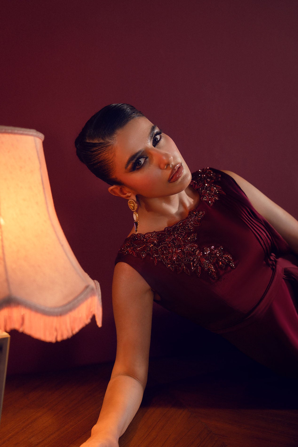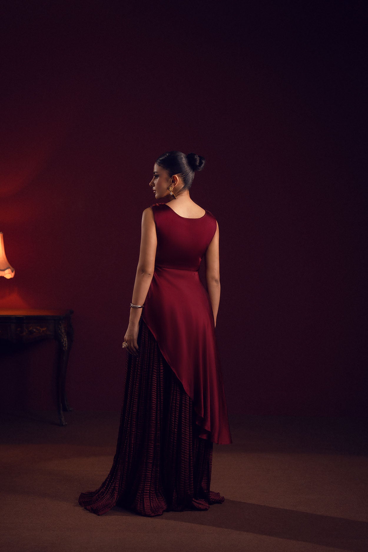 A deep burgundy silk gown featuring a draped silhouette with embellished neckline, radiating power and poise.