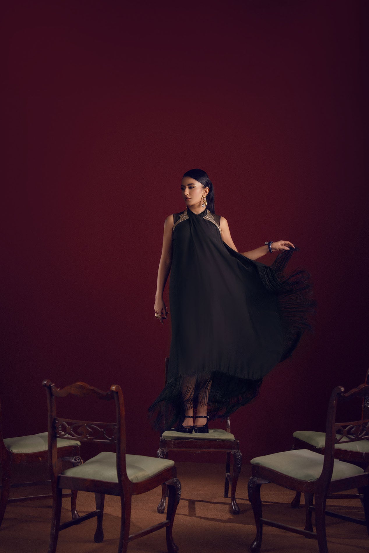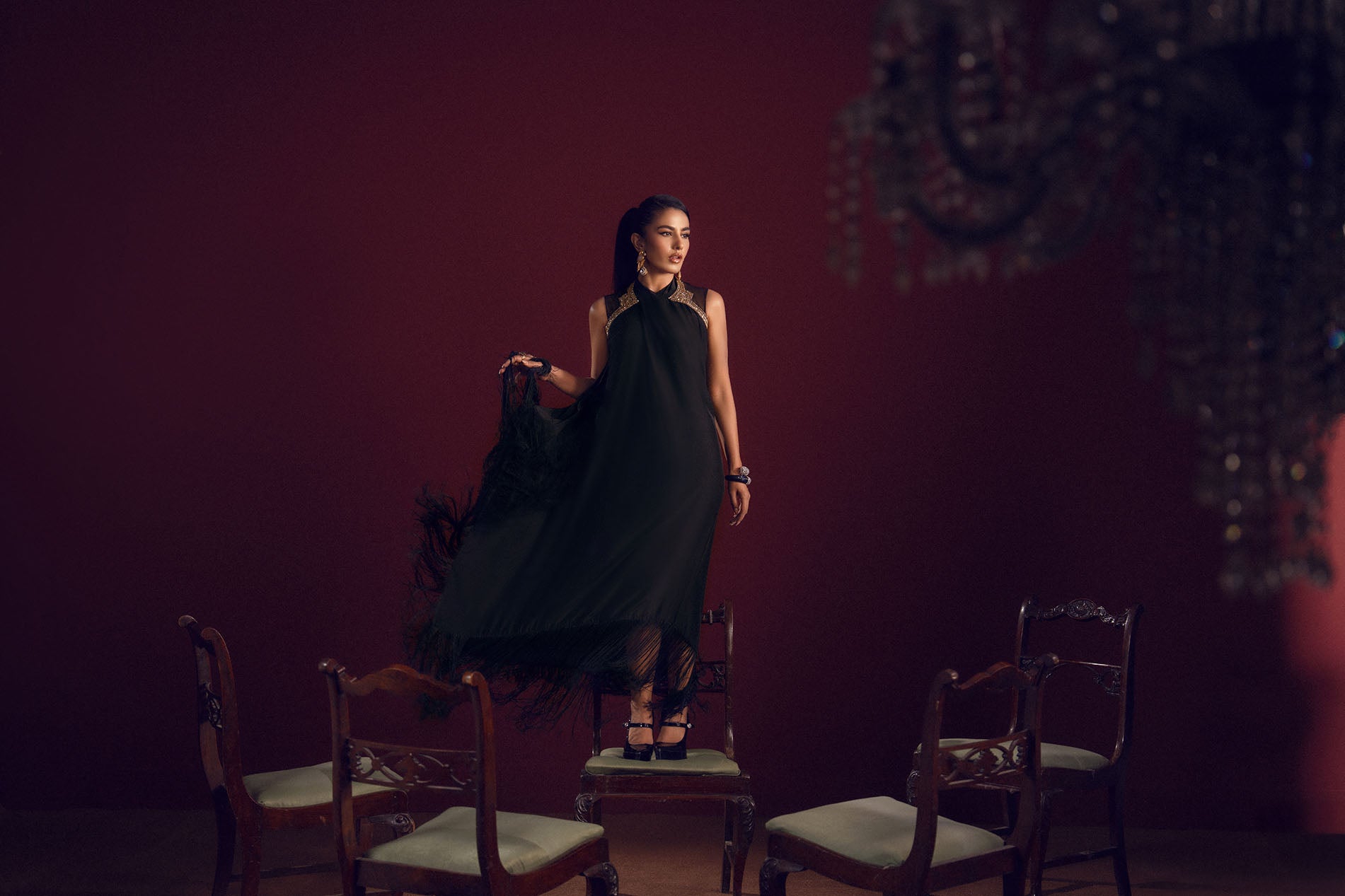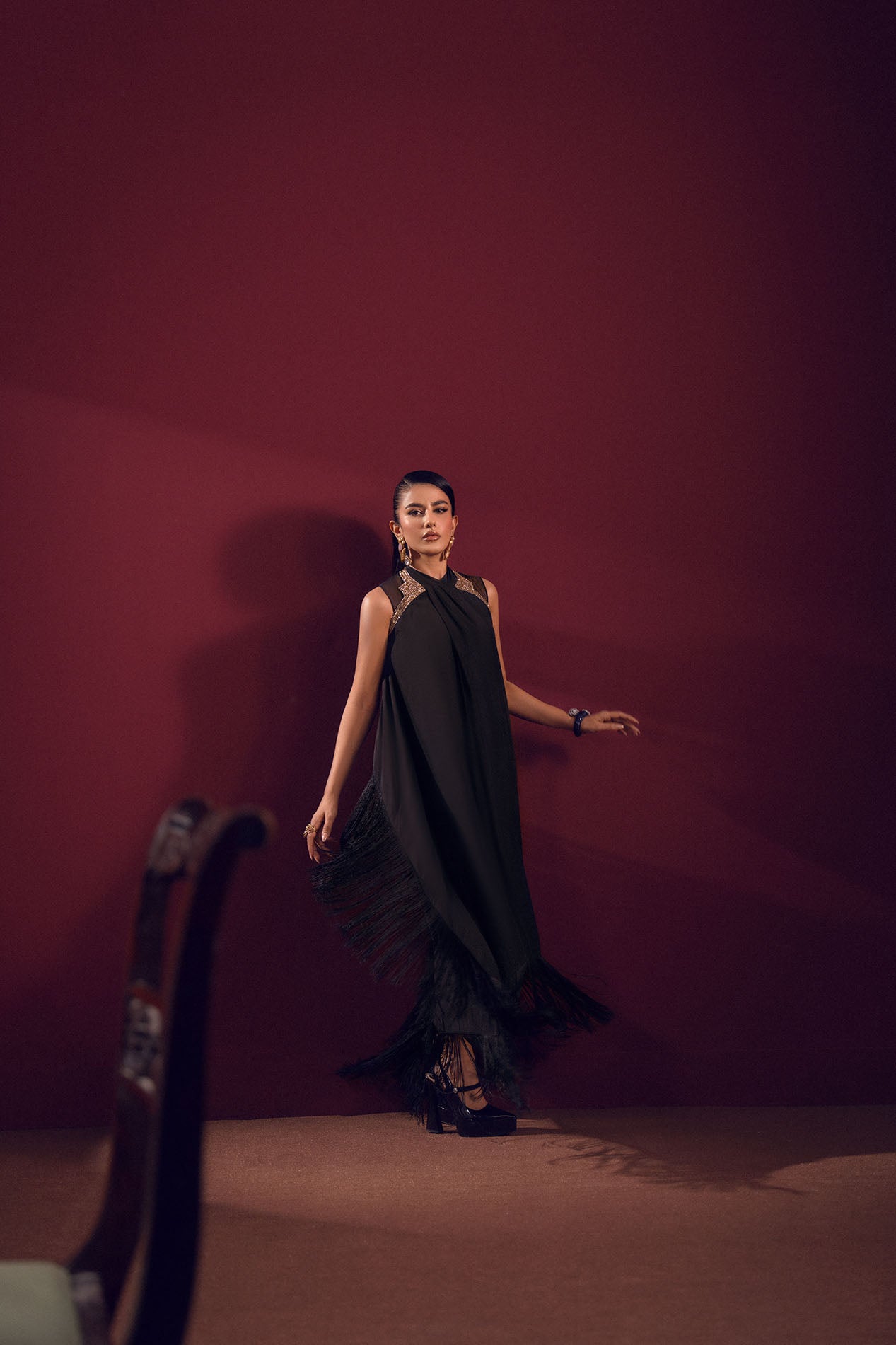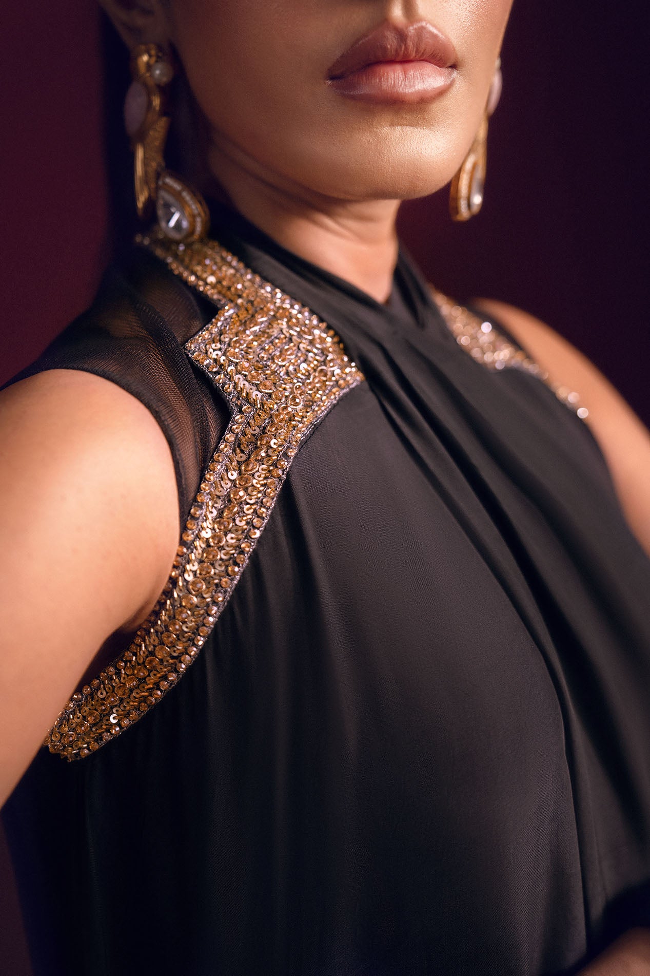 A striking black silhouette in tasal silk, elevated with a goldembellished