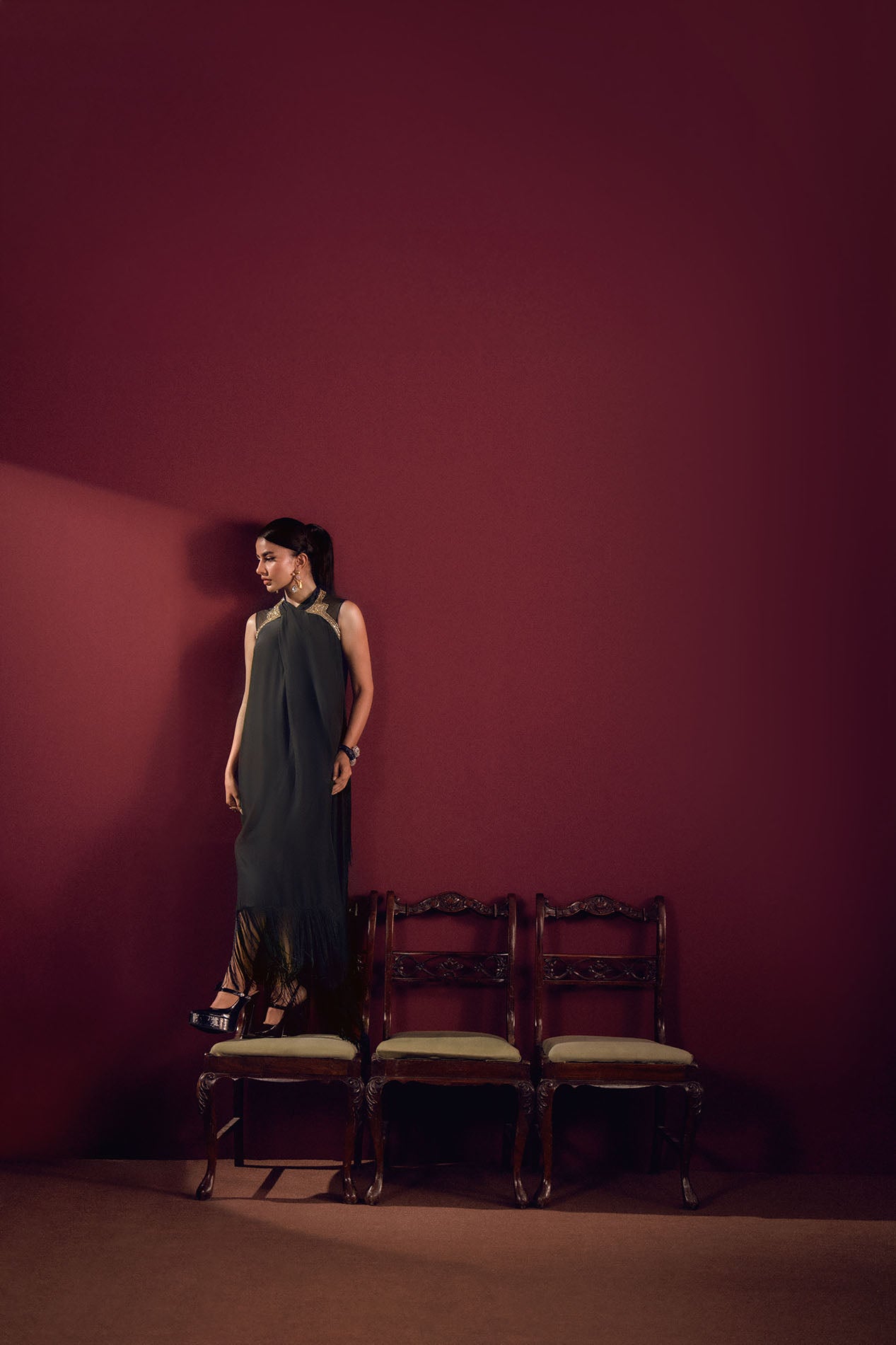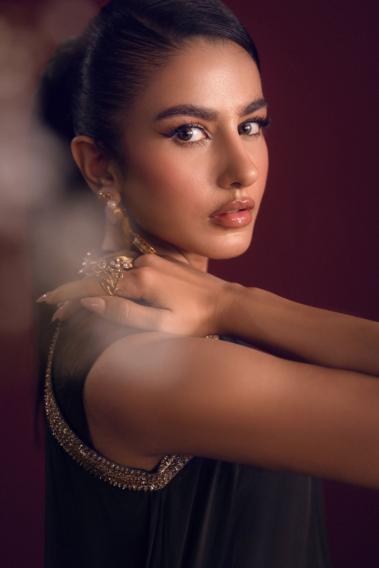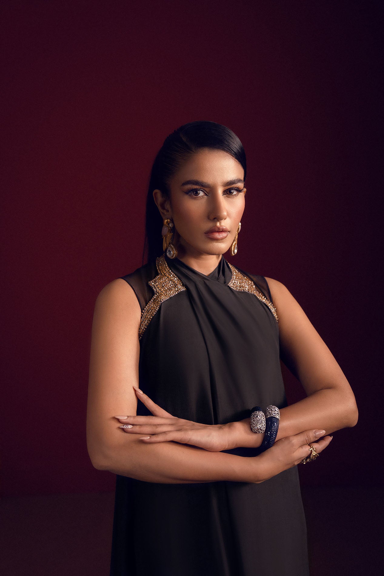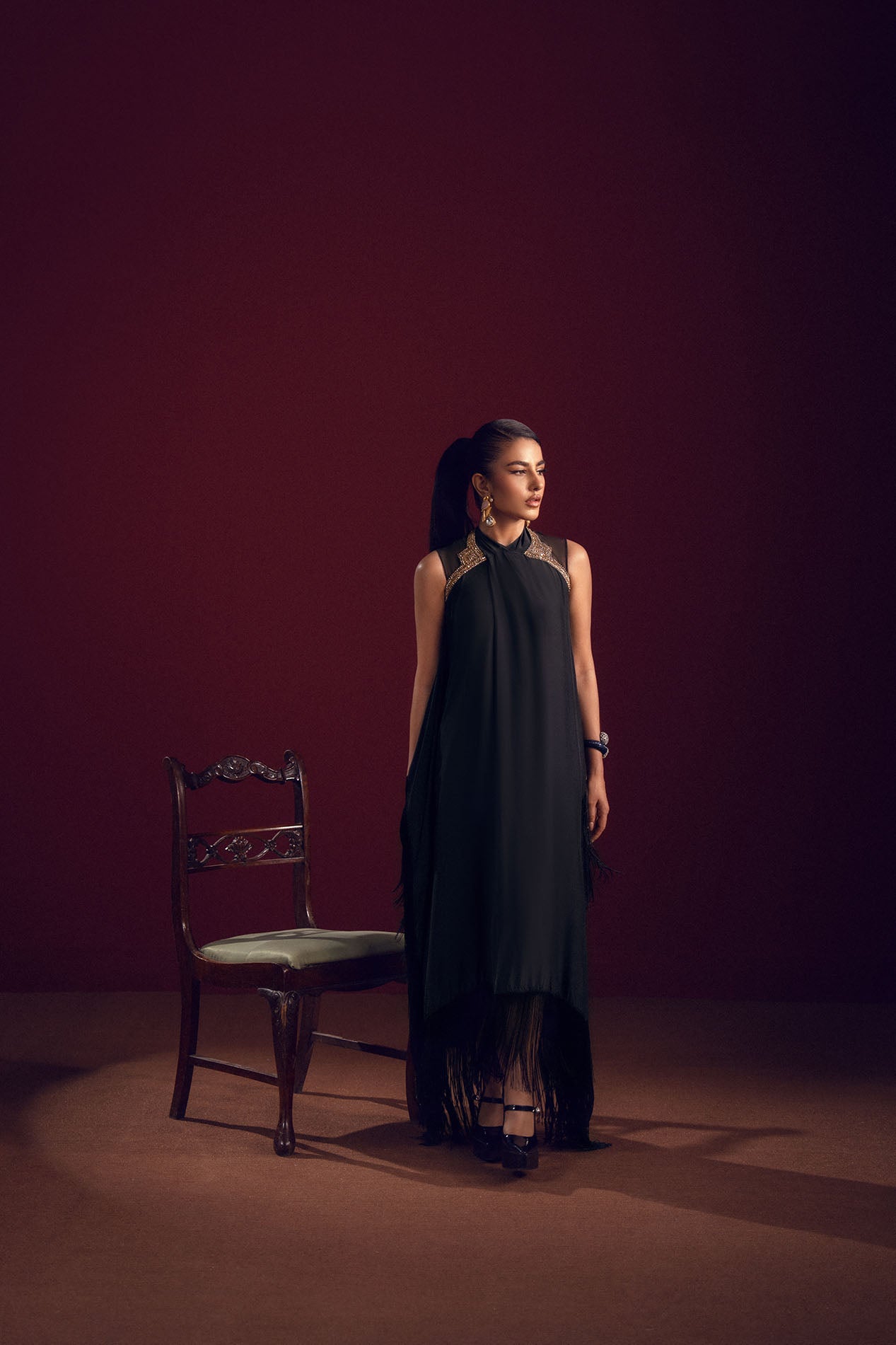 A striking black silhouette in tasal silk, elevated with a goldembellished