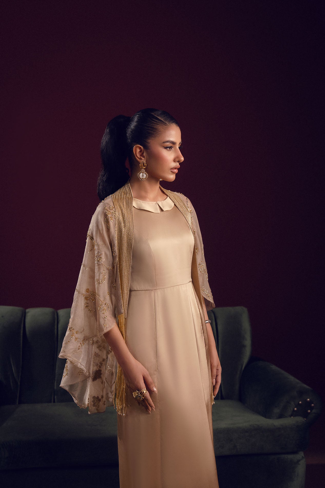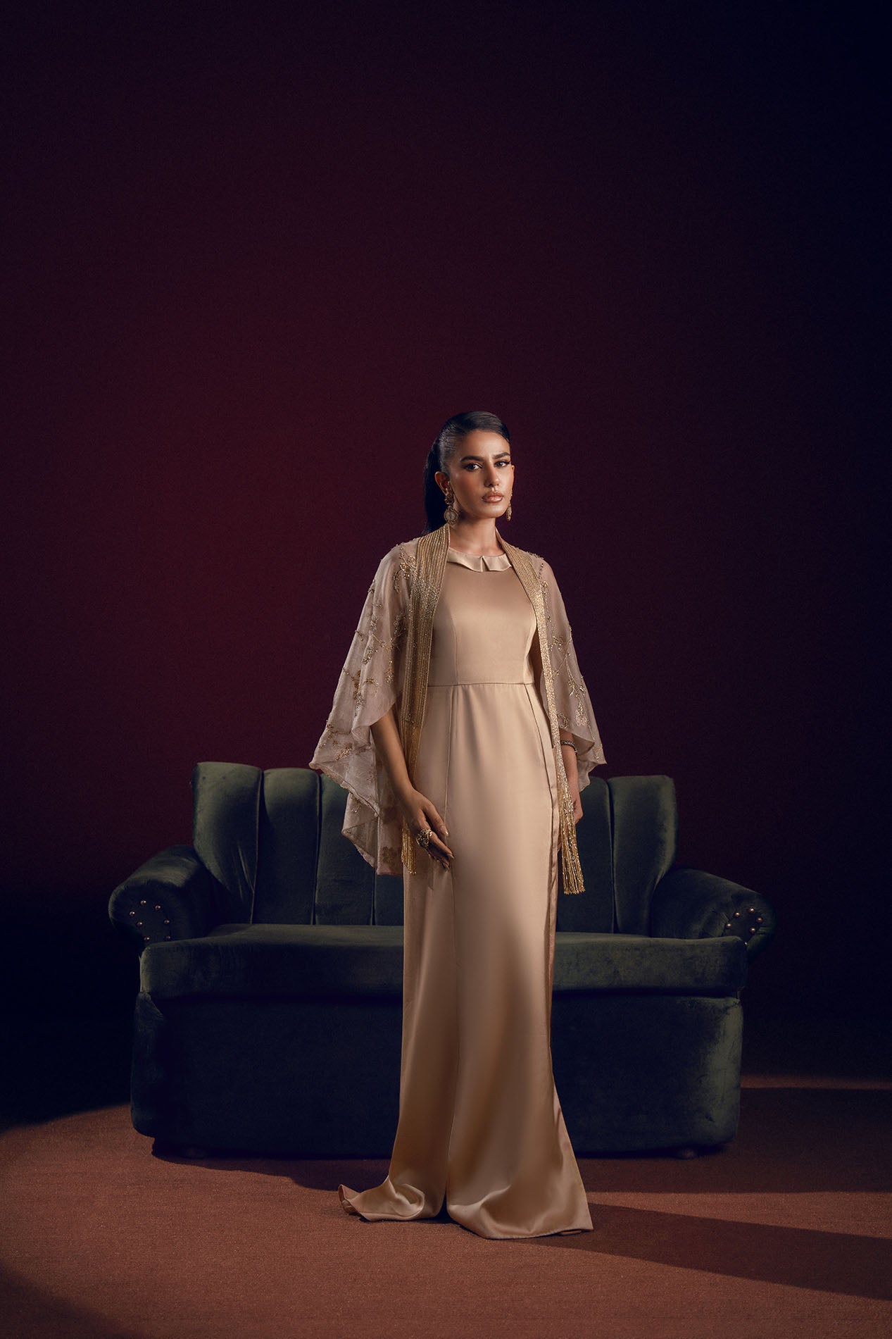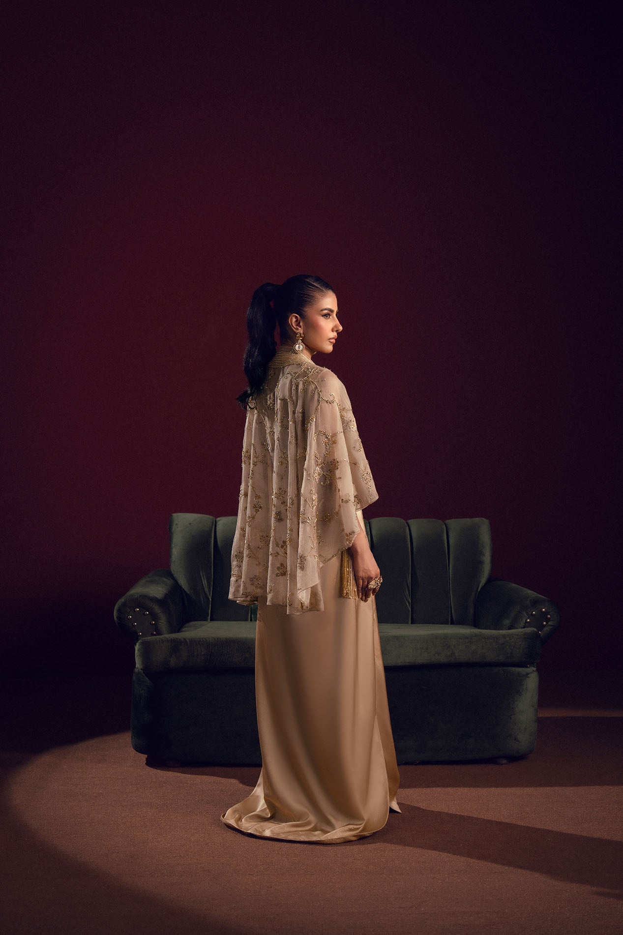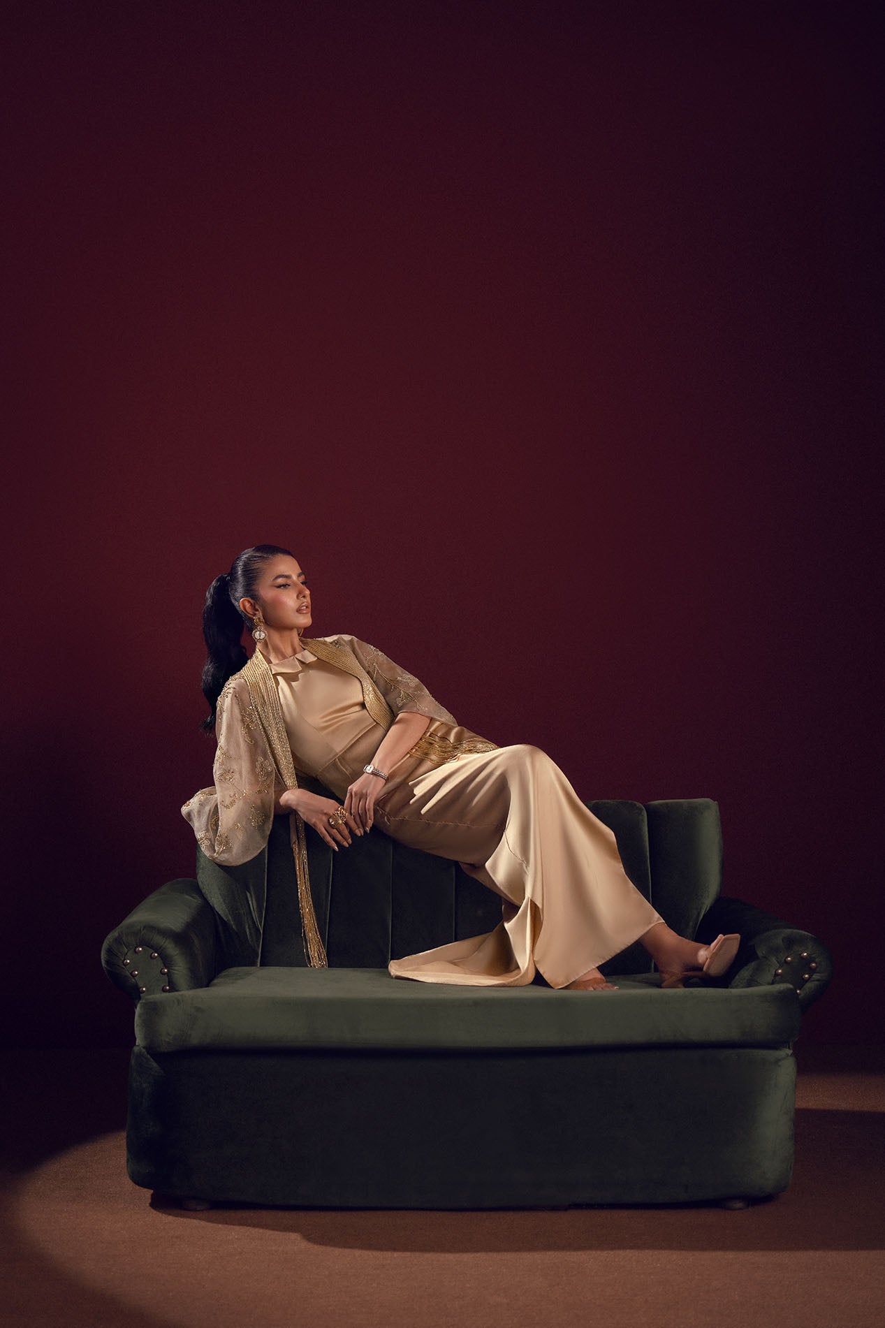 An emerald silk skirt set layered with a hand embellished jacket, merging richness with effortless poise.