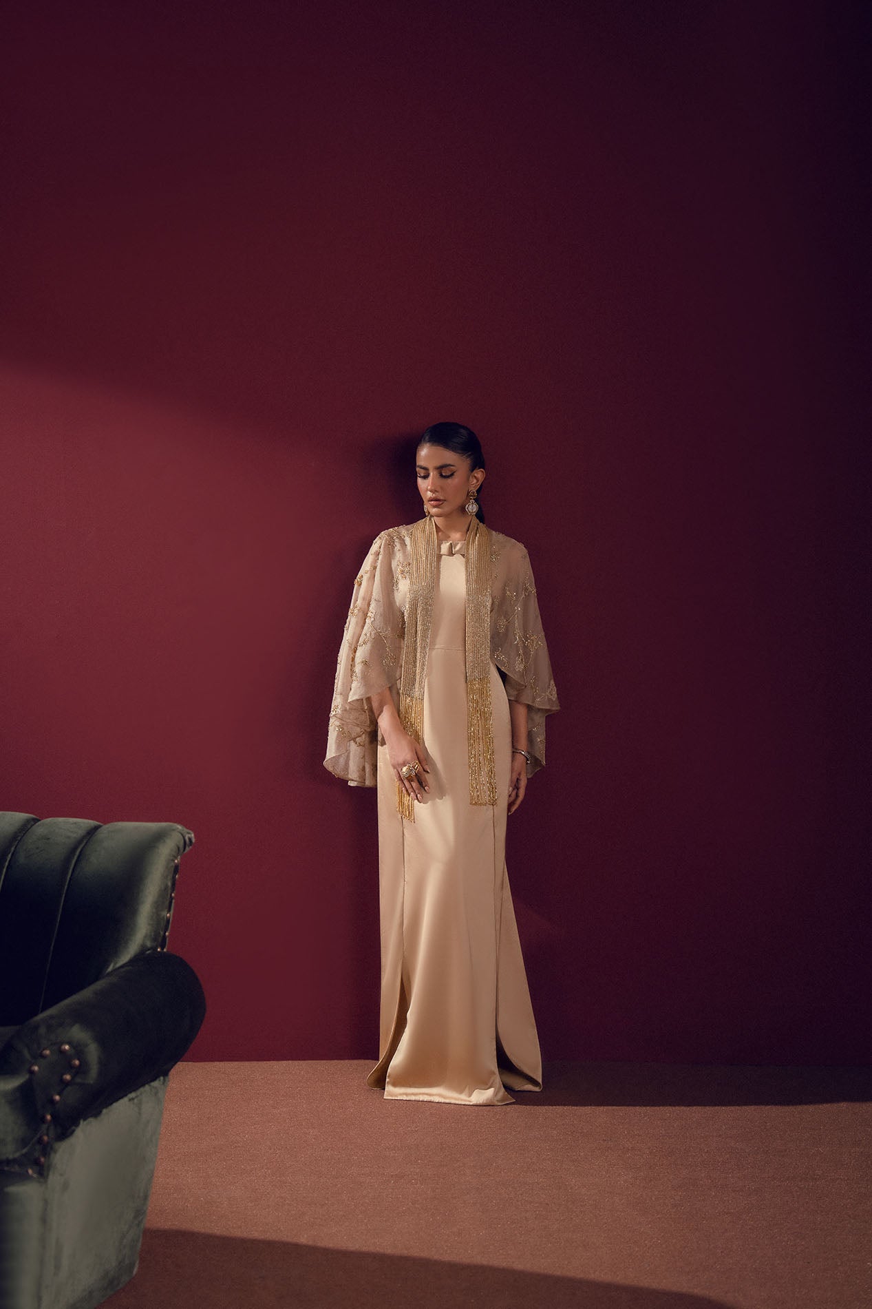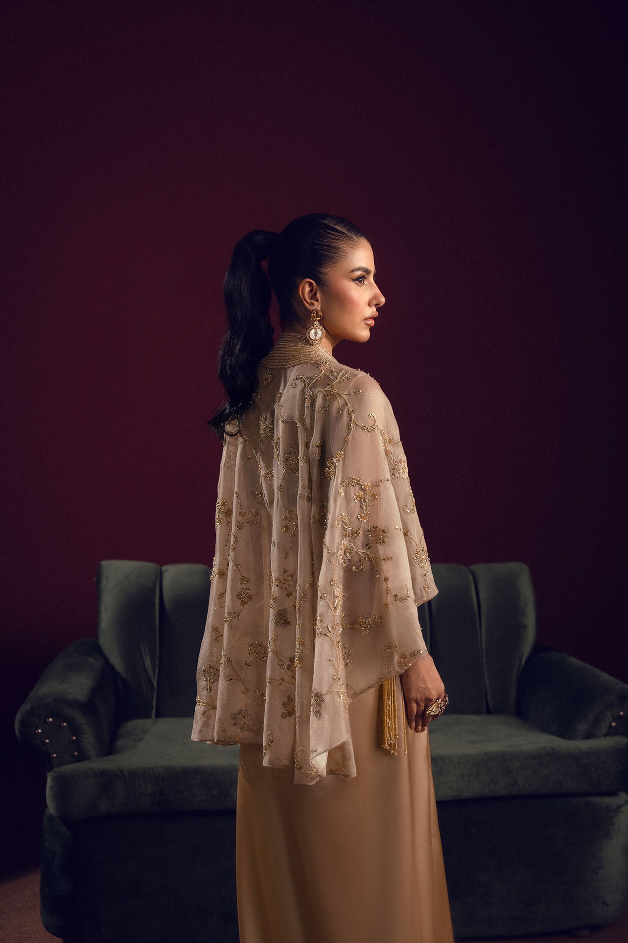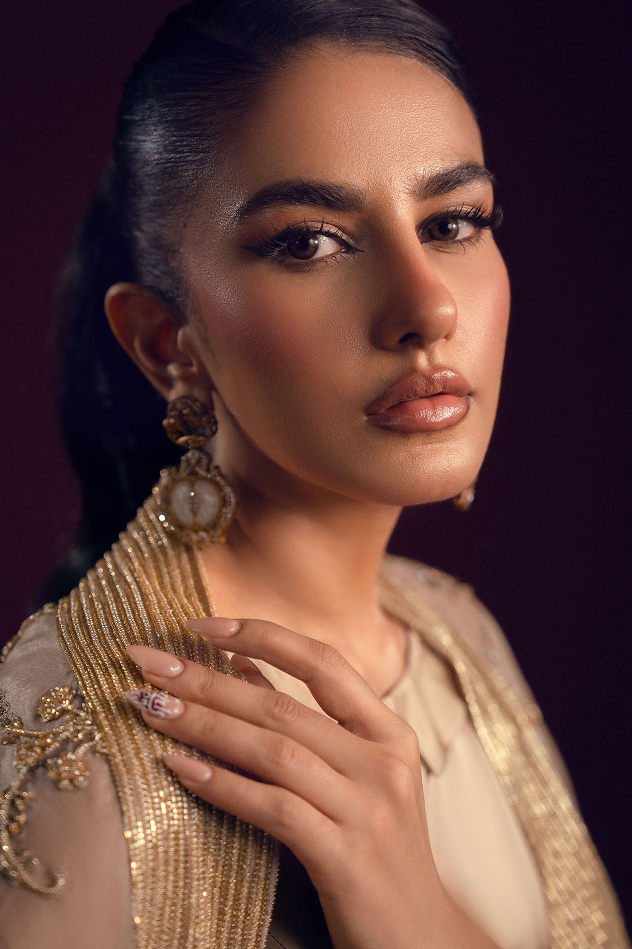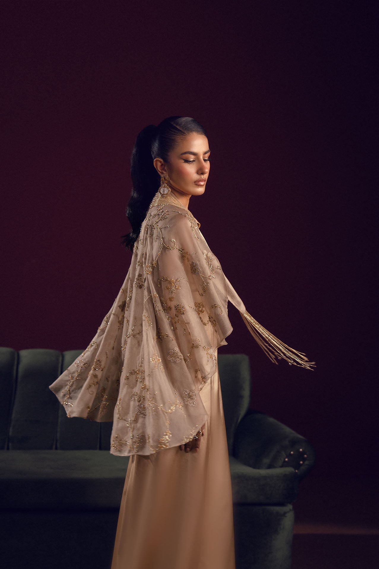 An emerald silk skirt set layered with a hand embellished jacket, merging richness with effortless poise.