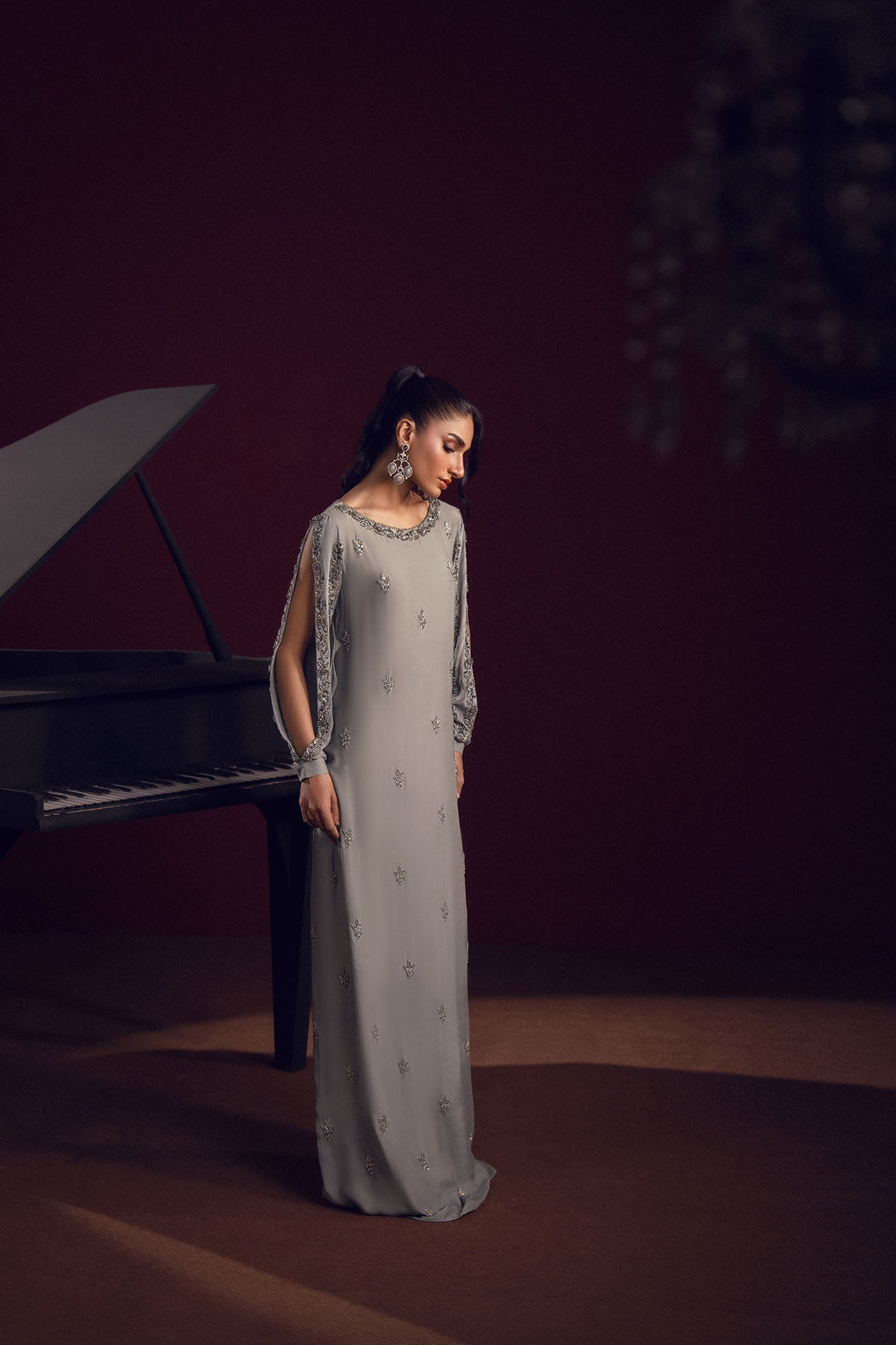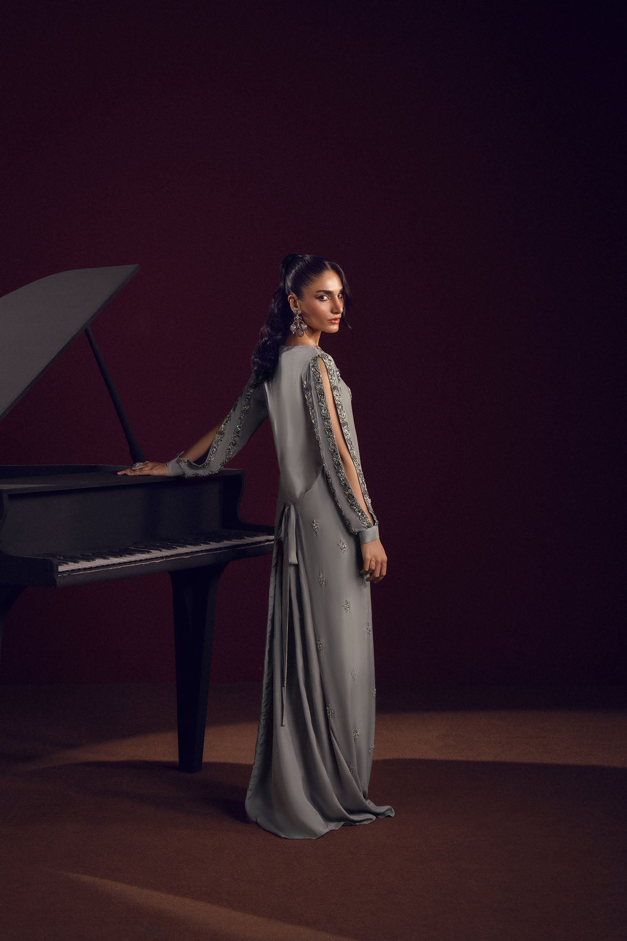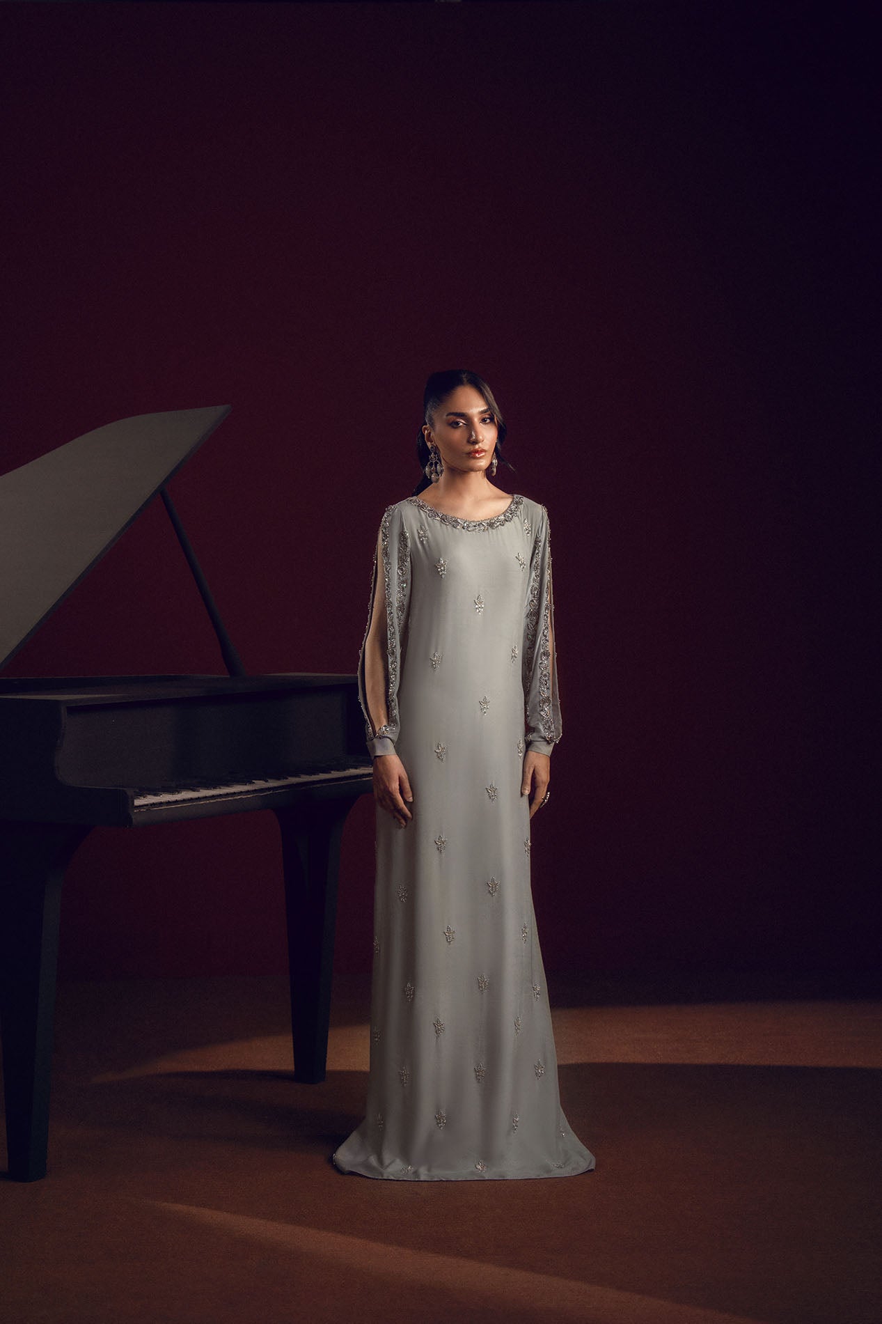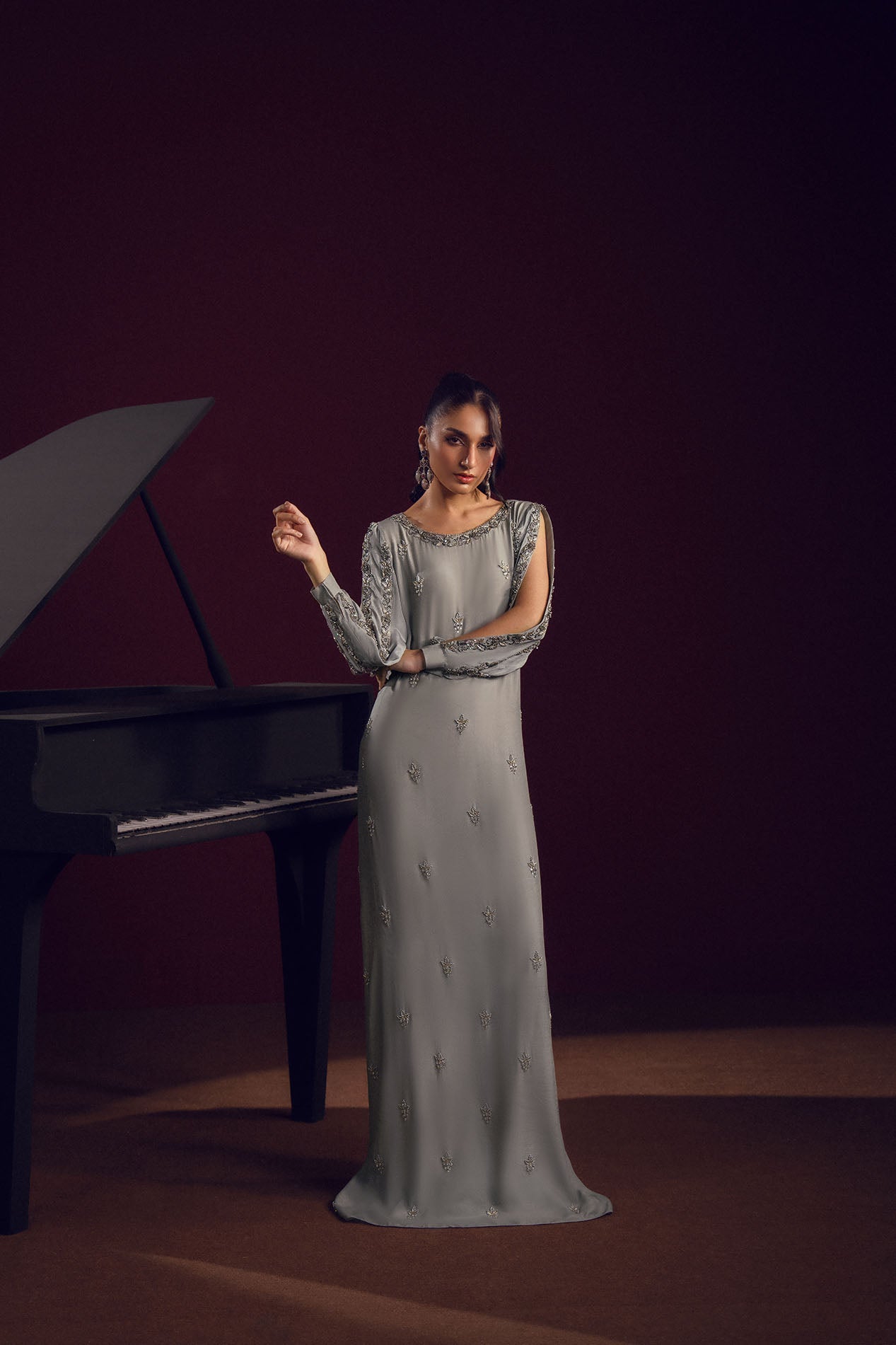 A silver-grey silk gown adorned with delicate embellishments across the sleeves and bodice, radiating understated elegance.
