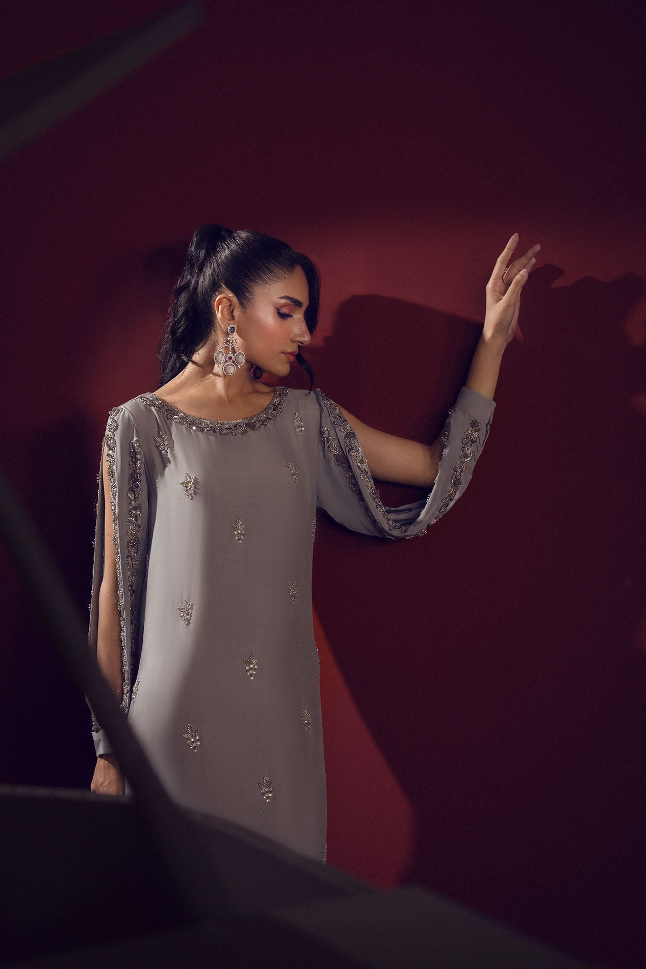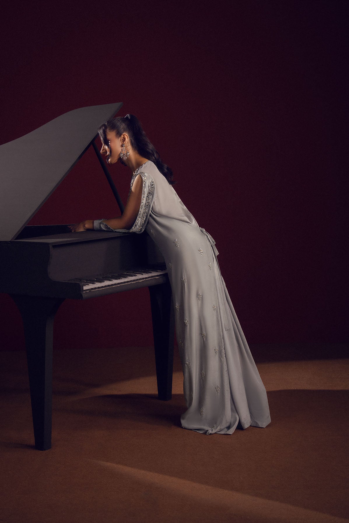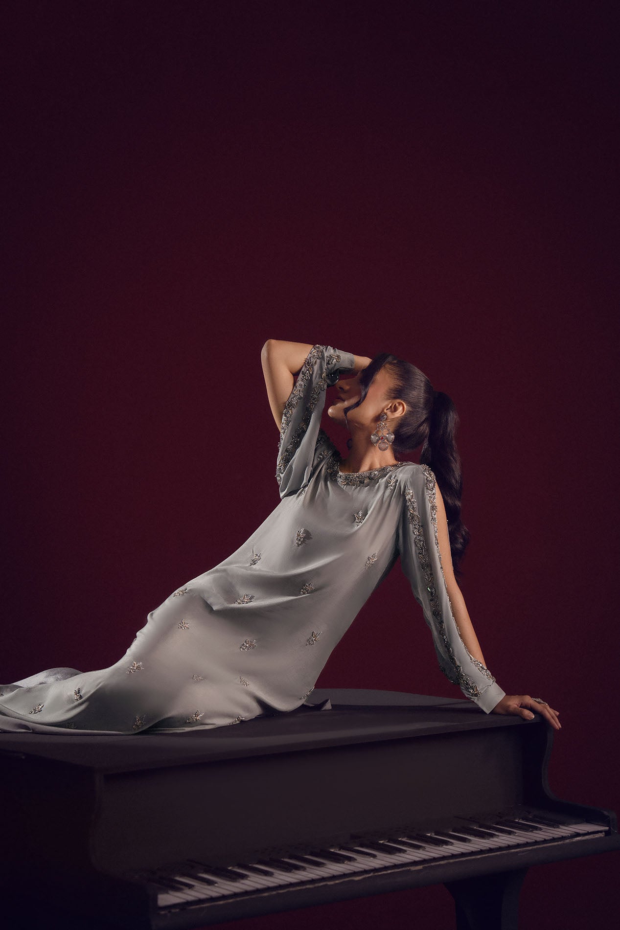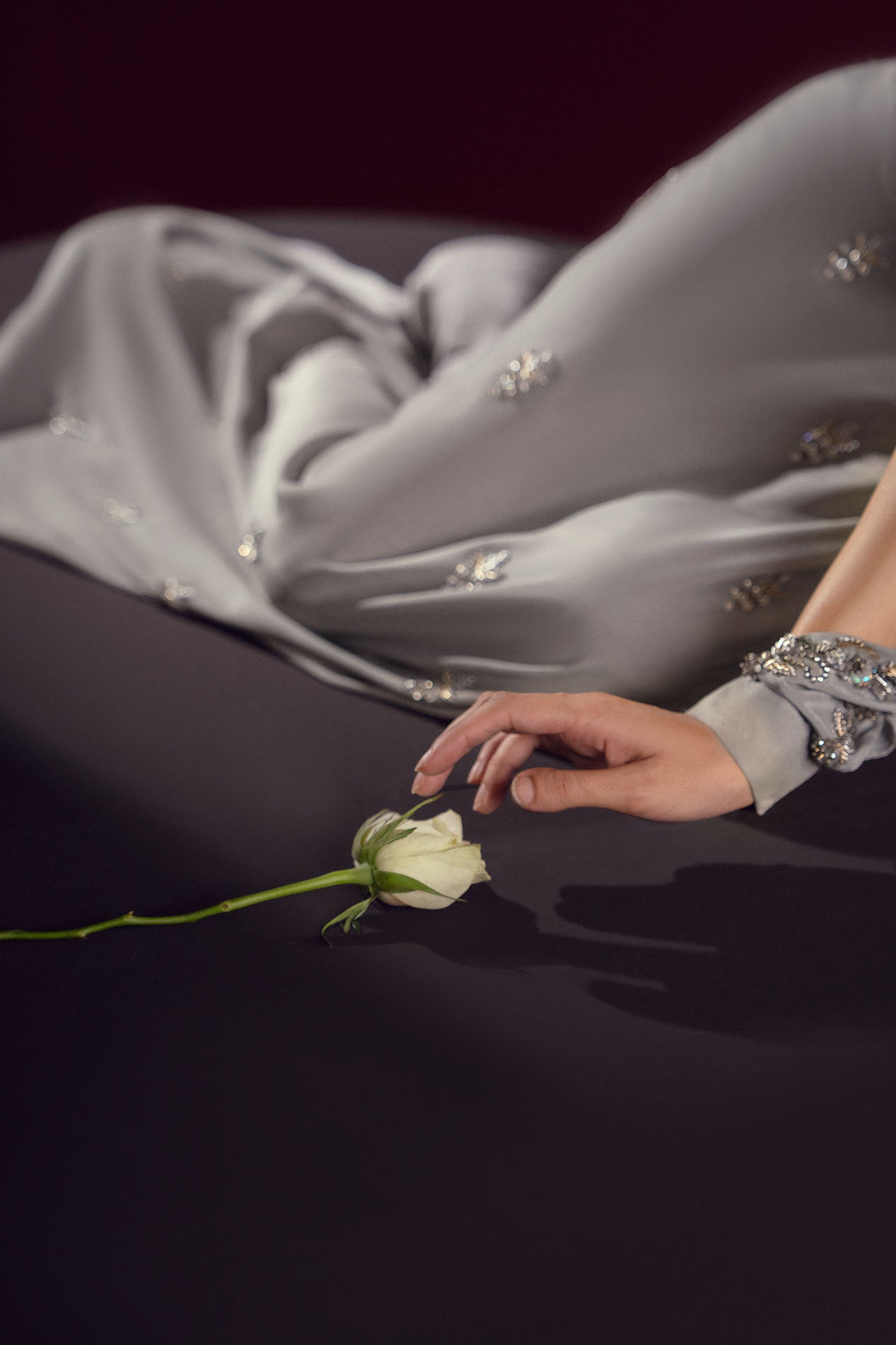 A silver-grey silk gown adorned with delicate embellishments across the sleeves and bodice, radiating understated elegance.