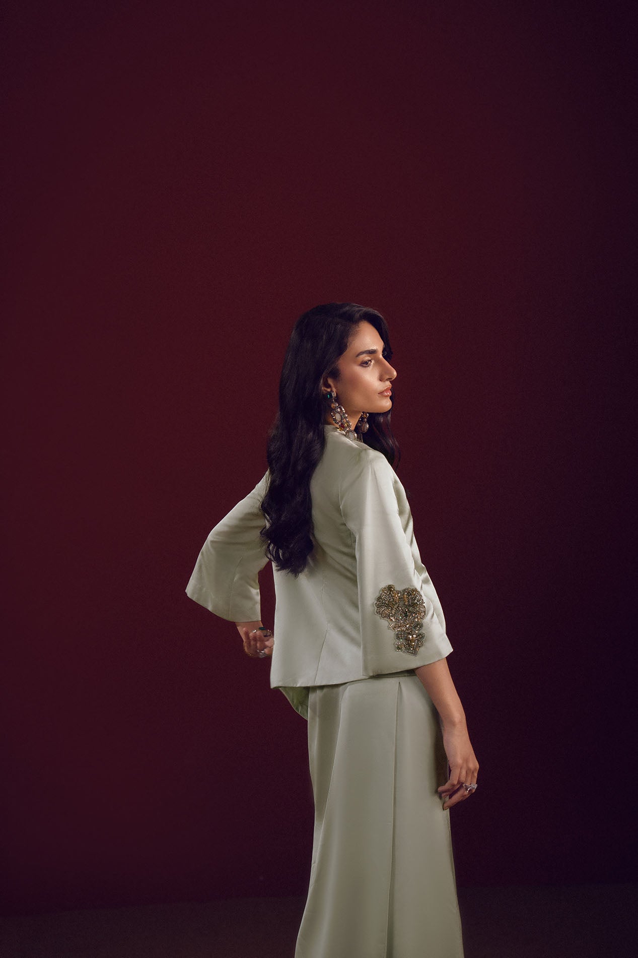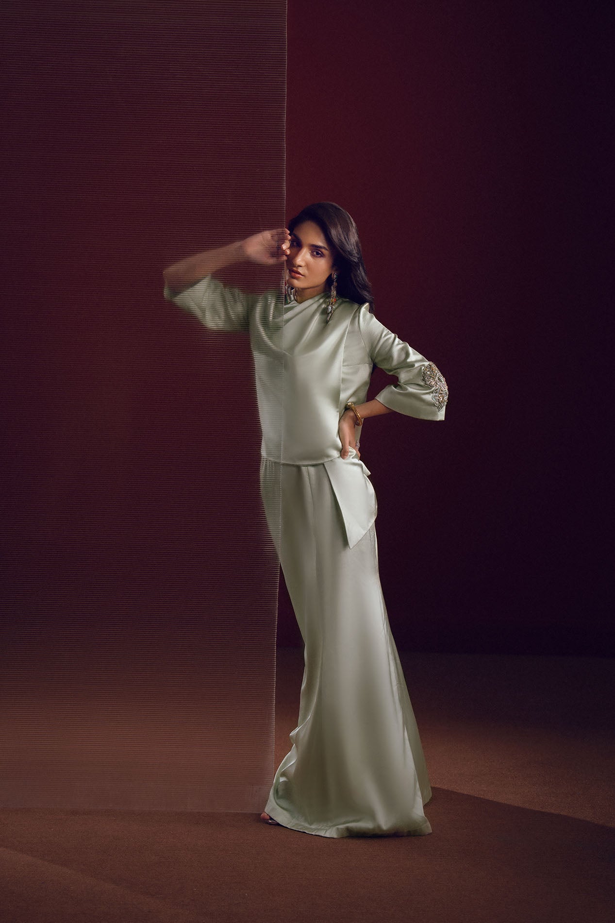 A soft mint silk drape ensemble with subtle embellishments at the sleeves, embodying timeless grace and fluidity.